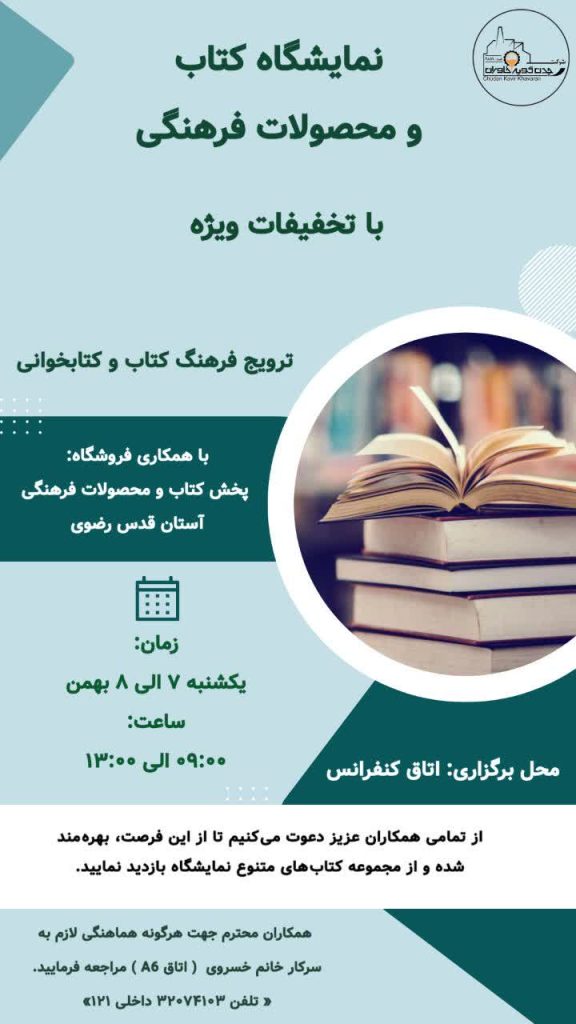 زمان برگزاری: از تاریخ  ۷ الی ۸ بهمن از تمامی همکاران عزیز دعوت می‌کنیم تا از این فرصت، بهره‌مند شده و از مجموعه کتاب‌های متنوع نمایشگاه بازدید نمایید.